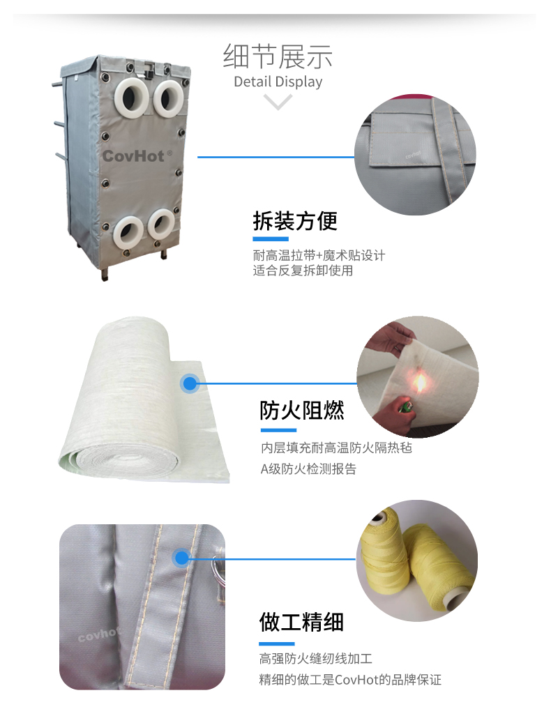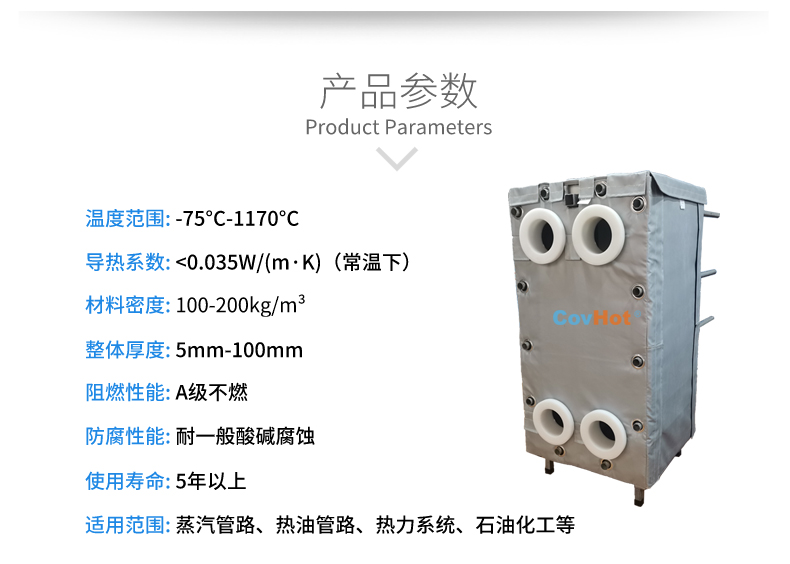 針對以上的問題,河北科好特科技有限責任公司自主研發的節能型板換保溫衣,可以有效減少換熱器的熱量損耗,而且在施工過程中安裝拆卸方便,節省人工,可拆卸保溫衣還可重復使用,起到節能降耗的效果??坪锰?a href=http://m.lsahbz.com/e/tags/?tagname=%E5%8F%AF%E6%8B%86%E5%8D%B8%E4%BF%9D%E6%B8%A9%E8%A1%A3 target=_blank class=infotextkey>可拆卸保溫衣根據設備不同的尺寸形狀量身定制,可廣泛用于換熱器、閥門、管道及其它需要保溫或防凍的領域。